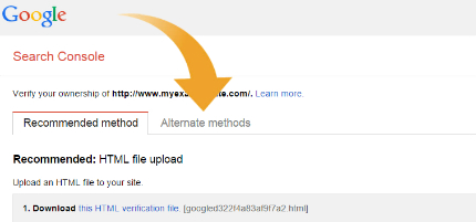 Next, Google needs to confirm that this website or app belongs to you. To verify that you are the site owner, you have several choices. Click the “Alternate Methods” tab to view them all.