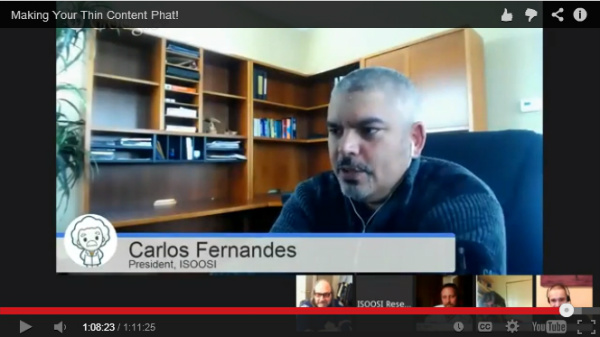 What can a website do to fix thin content? Last week’s ISOOSI Tuesday Chat, a Google+ Hangout-on-Air hosted by ISOOSI Research Engine, dealt with this issue. In Making Your Thin Content Phat!, host and ISOOSI President Carlos Fernandes talked with four Internet marketing experts: Ammon Johns, David Harry, Terry Van Horne and Bill Slawski. What follows are the questions, problems and solutions this panel of experts discussed during the Hangout.