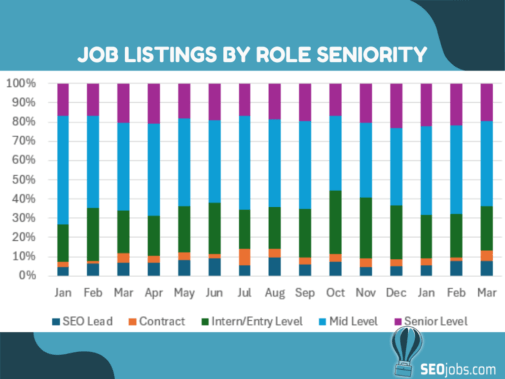 “…mid-level SEO roles are being impacted the most year over year. Q1 of 2024 vs. Q1 of 2023 shows an emphasis on hiring senior-level talent (+3%) and intern/entry-level talent (+1%), while mid-level is down (-6%).”